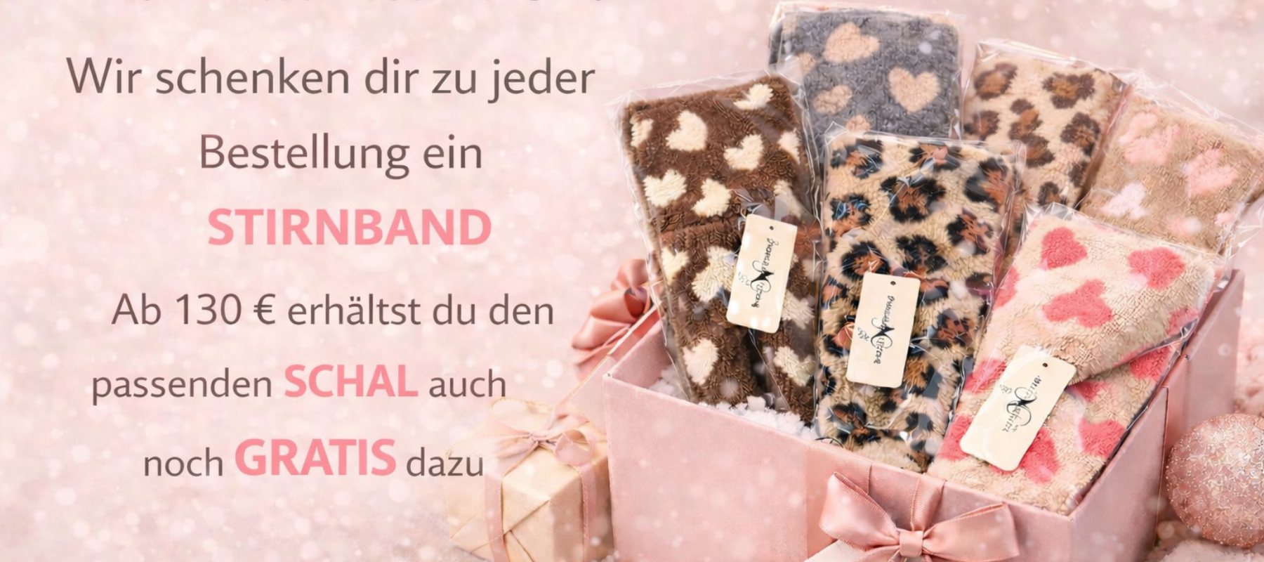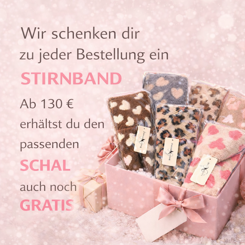 Zu jeder Bestellung schenken wir dir ein kuscheliges Stirnband – ab 130 € erhältst du zusätzlich einen Schal!